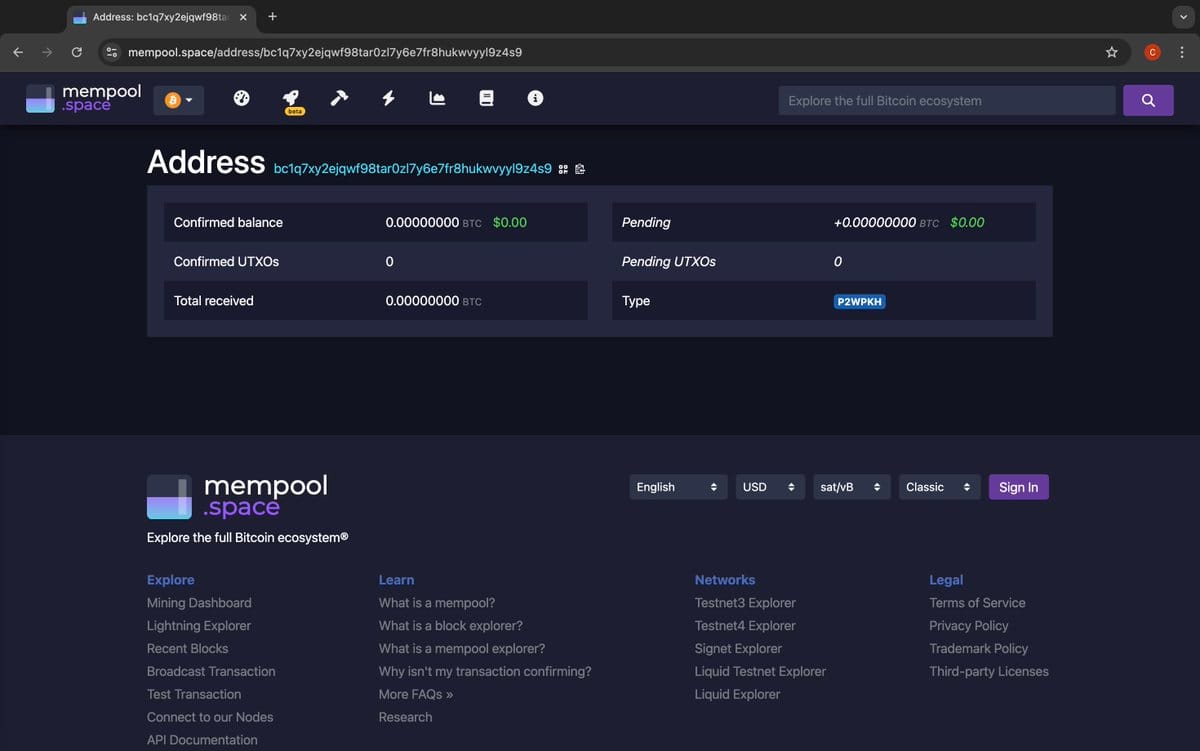 Here is a fresh bitcoin address- no balance, no transaction history.